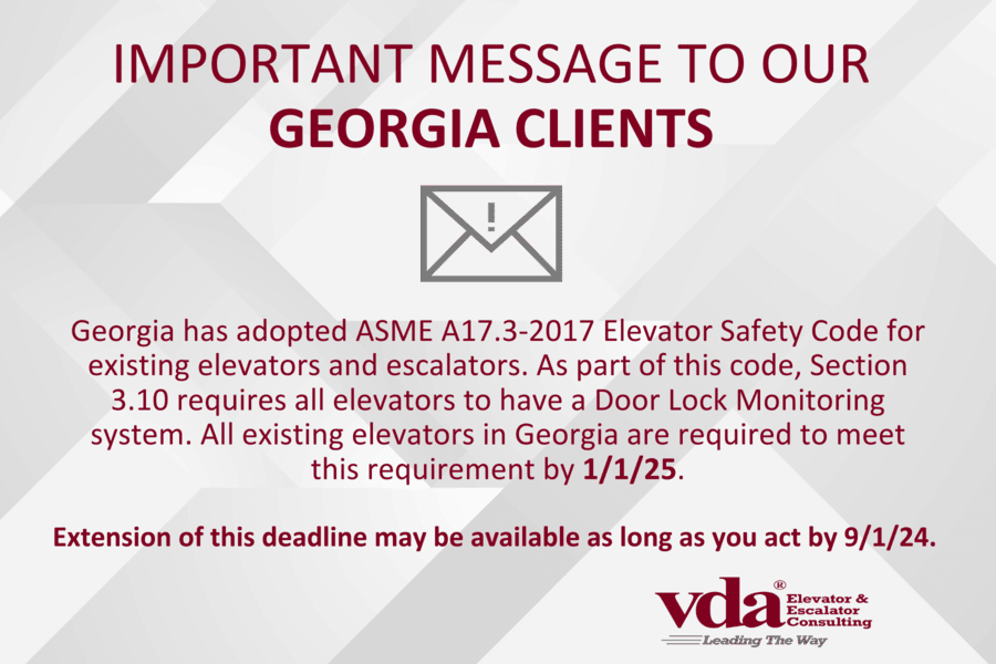 Georgia has adopted ASME A17.3-2017 Elevator Safety Code for existing elevators and escalators. As part of this code, Section 3.10 requires all elevators to have a Door Lock Monitoring system. All existing elevators in Georgia are required to meet this requirement by January 1, 2025. See the notice below.