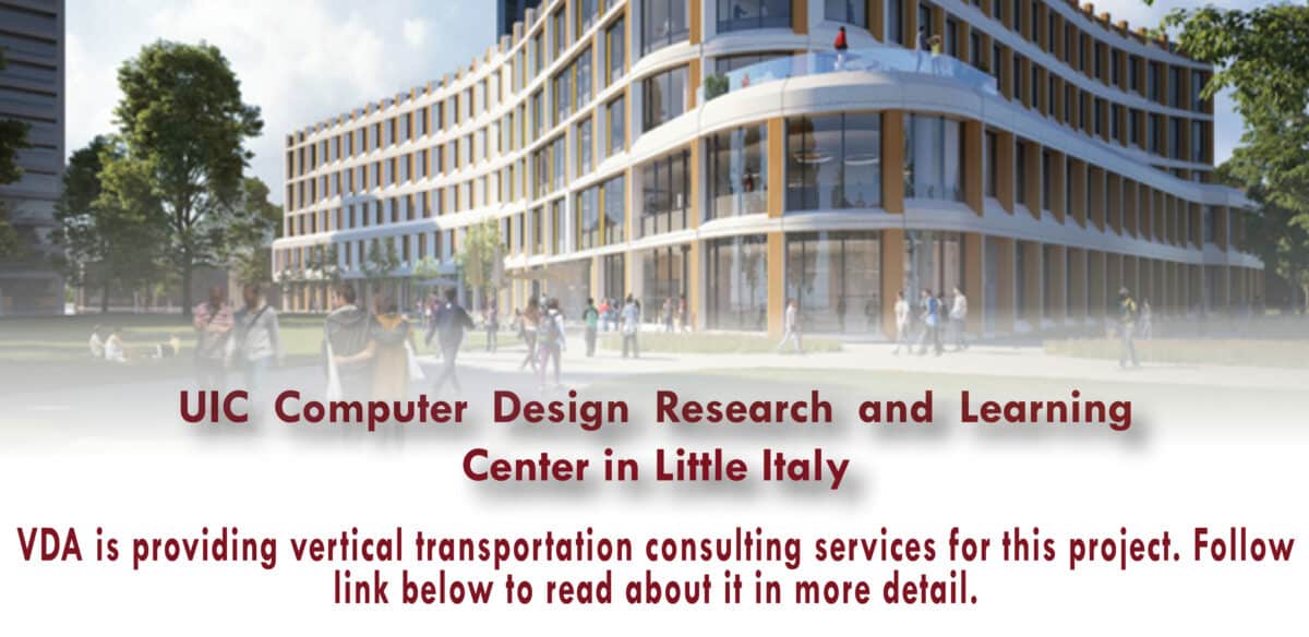 The New Construction Design Team with VDA located in Naperville, IL is proud to be a member of the Booth Hansen/LMN Architects design team for the University of Illinois Computer Design, Research and Learning Center. VDA work closely with the design team along with UIC and the Capital Development Board of Illinois on the design of traction elevator system for this project.